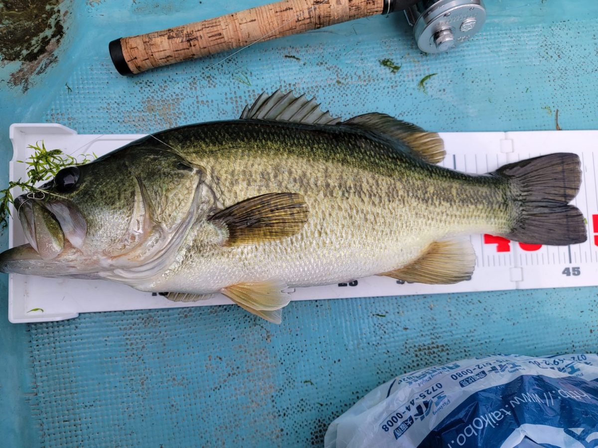 今の時期はウィードがあるとこしか釣れないので、下物1で釣ってたら例のライバルがまた来た。こいつ、毎日来てるんちゃうか笑