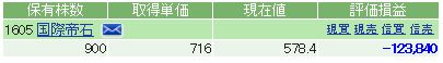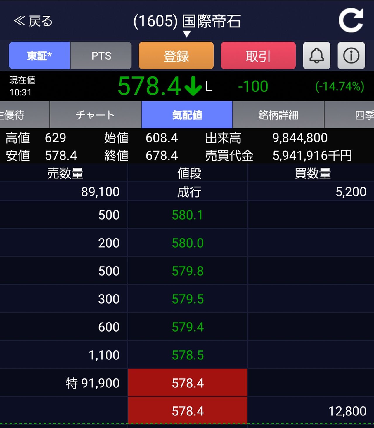そんな中、国際帝石を2.3日前に買ったら本日(3/13)ストップ安www