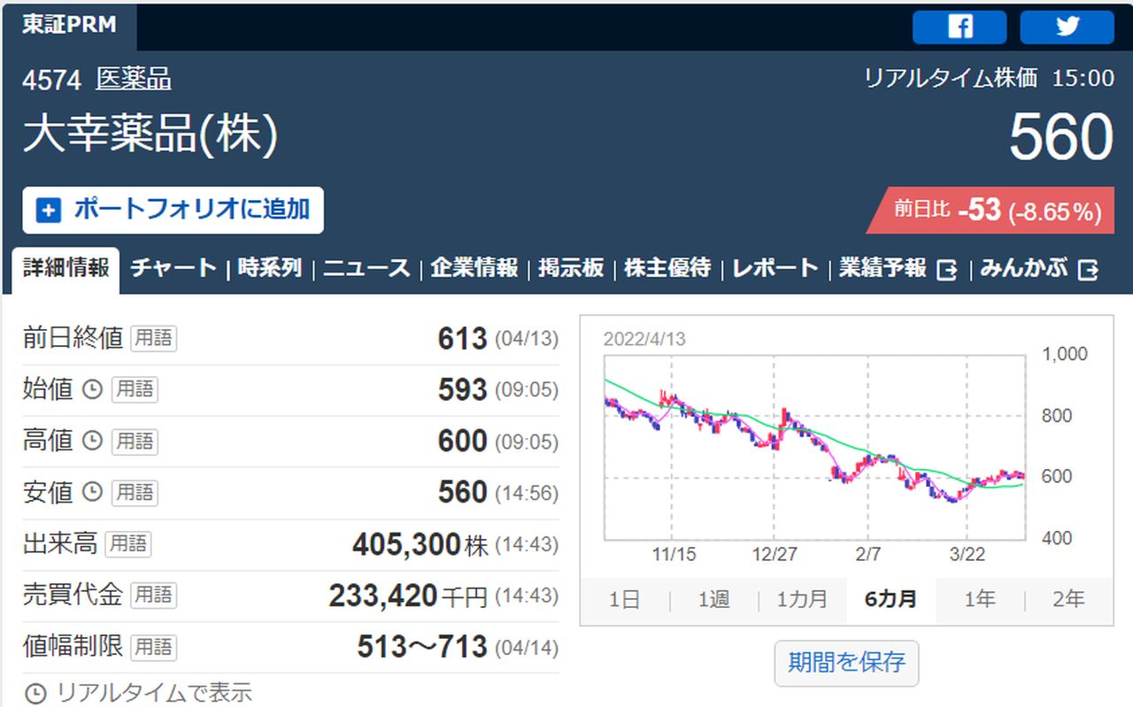 本日、大幸薬品(4574)の株価が急落したことについて解説します。