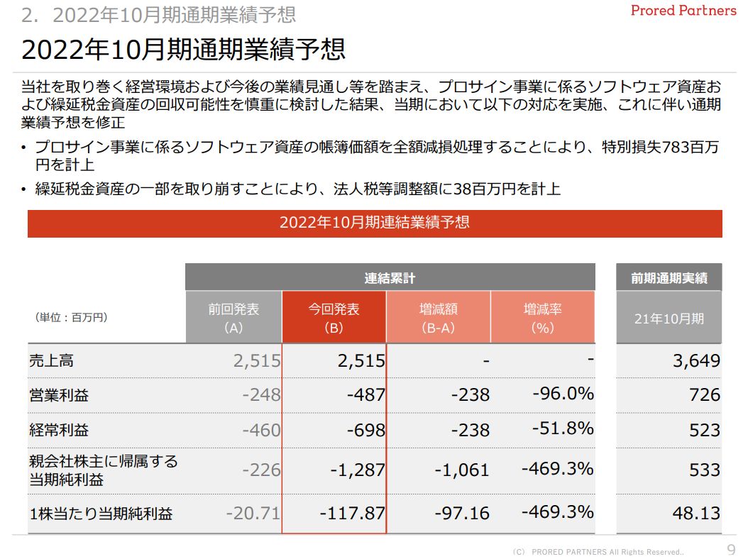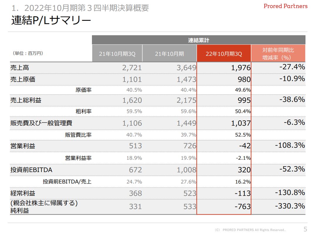 株式会社プロレド・パートナーズ 2022年10月期第3四半期決算