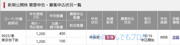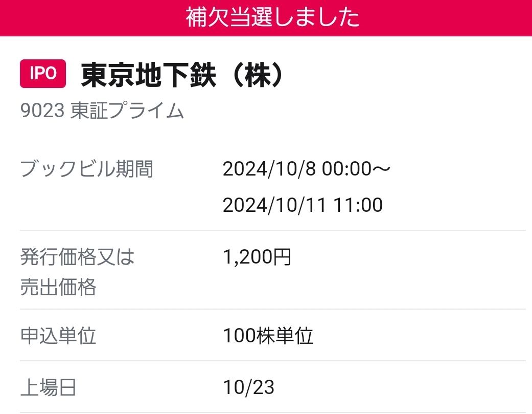 今日のお題は東京地下鉄[東京メトロ](9023)当選のご報告です。