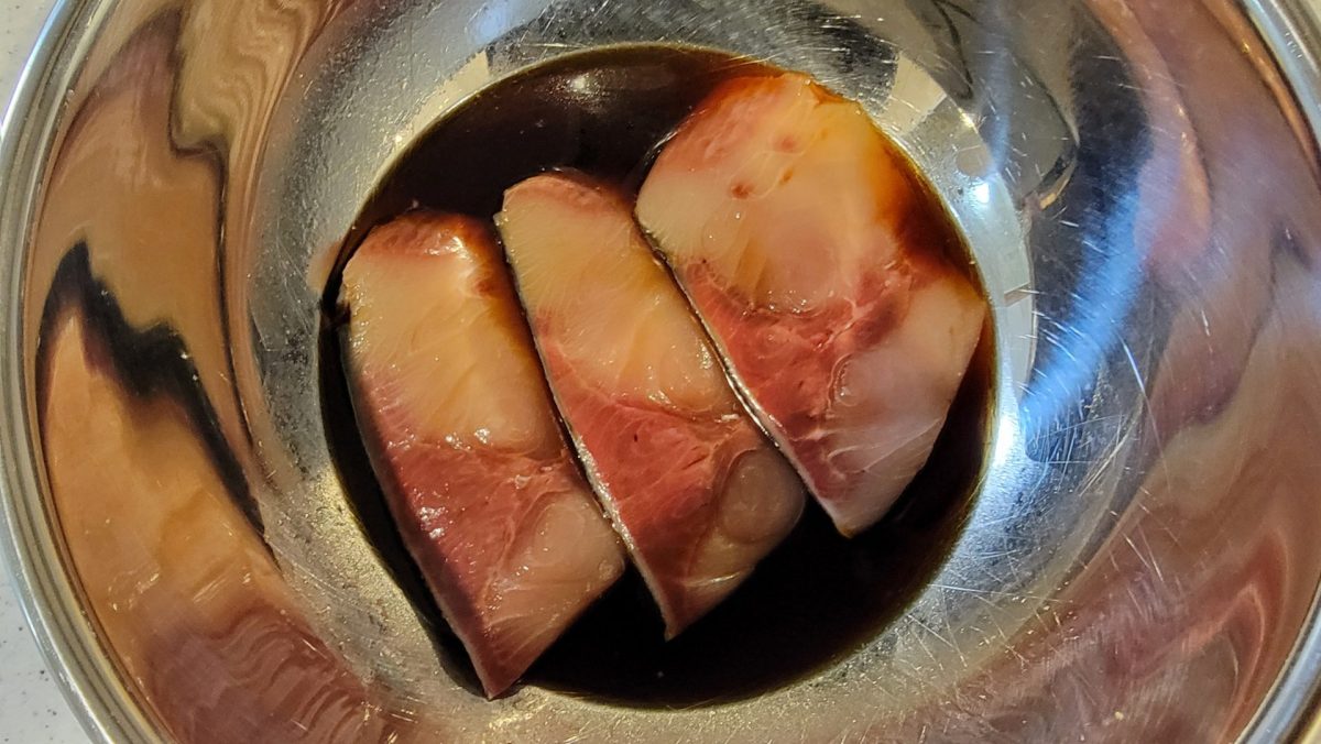 さっそくスーパーで買ってきたブリをタレにつけます。