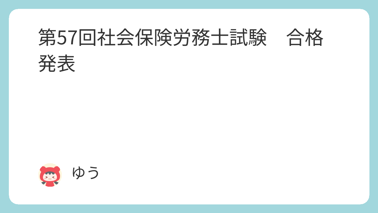 第57回社会保険労務士試験 合格発表 社労士 X Facebook はてブ Pocket LINE コピー 2025.10.01 合格発表速報です。 第57回社会保険労務士試験 合格発表 社会保険労務士試験の合格基準及び正答について_R7.pdf 合格率5.5%