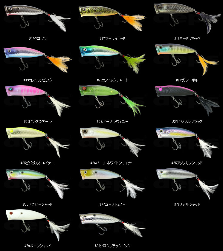 直進性を高める膨らみを両サイドに設けたフラットなカップ形状と、水平に近い斜め浮き姿勢を重要視した特徴的なデザイン&セッティングは、正面から受ける水をカップが逃さずに含み、しっかりと前へ押し出す事のできるポッパーとして仕上げられています。
